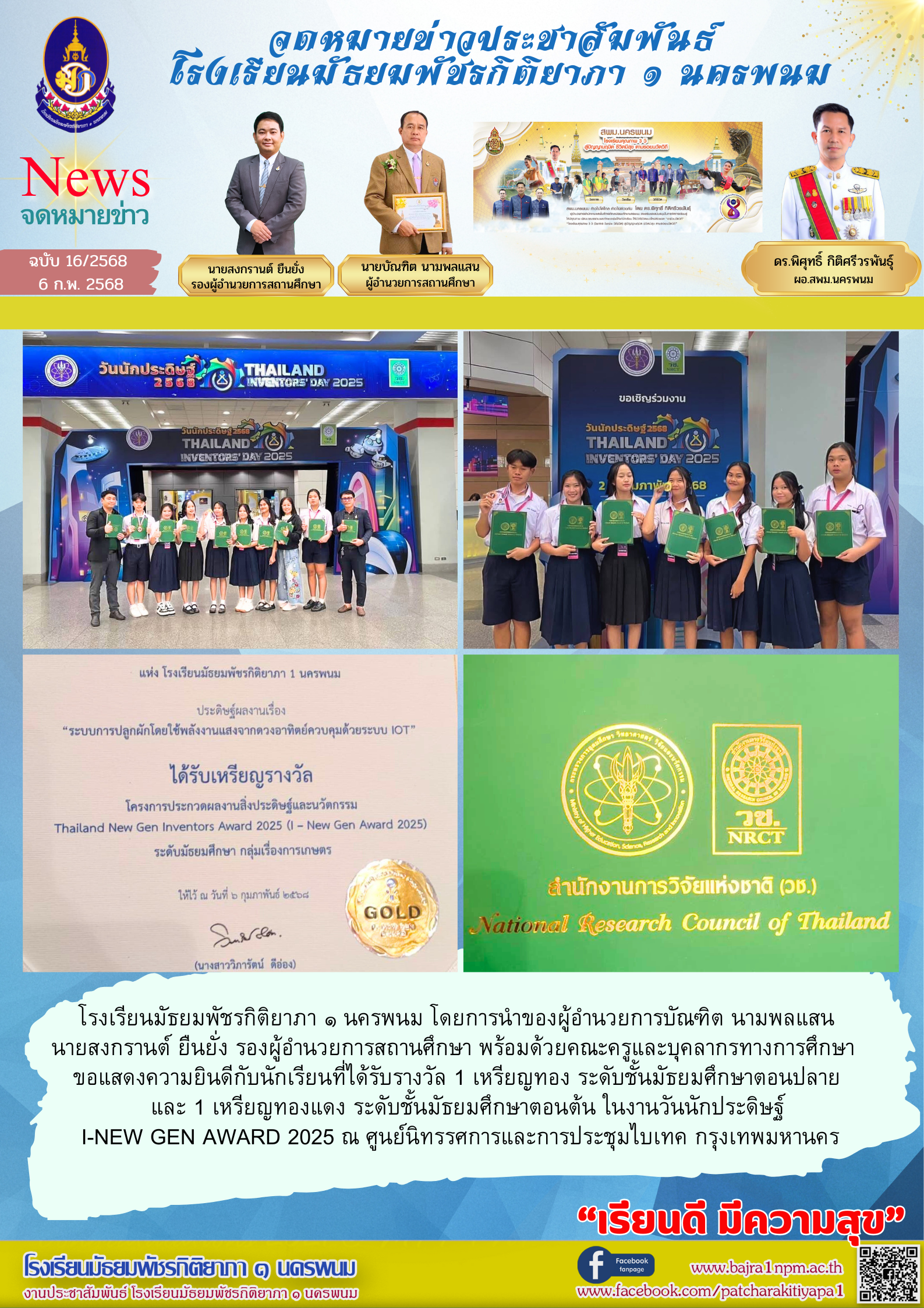แสดงความยินดีกับนักเรียนที่ได้รับรางวัล 1 เหรียญทอง ระดับชั้นมัธยมศึกษาตอนปลาย และ 1 เหรียญทองแดง ระดับชั้นมัธยมศึกษาตอนต้น ในงานวันนักประดิษฐ์