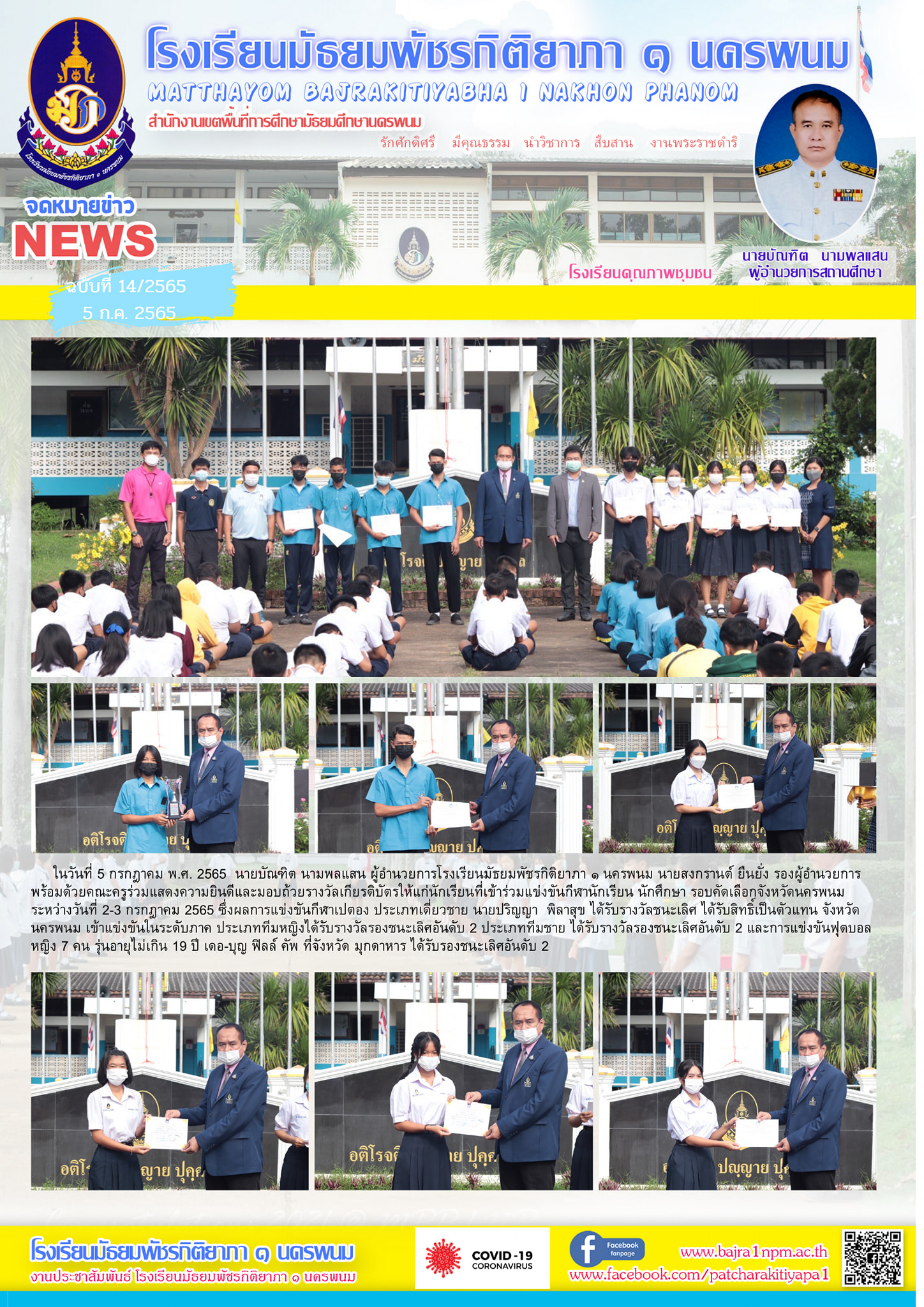 ร่วมแสดงความยินดีและมอบถ้วยรางวัลเกียรติบัตรให้แก่นักเรียนที่เข้าร่วมแข่งขันกีฬานักเรียน นักศึกษา รอบคัดเลือกจังหวัดนครพนม ระหว่างวันที่ 2-3 กรกฎาคม 2565 ซึ่งผลการแข่งขันกีฬาเปตอง ประเภทเดี่ยวชาย นายปริญญา พิลาสุข ได้รับรางวัลชนะเลิศ ได้รับสิทธิ์เป็นตัวแทน จังหวัดนครพนม เข้าแข่งขันในระดับภาค ประเภททีมหญิงได้รับรางวัลรองชนะเลิศอันดับ 2 ประเภททีมชาย ได้รับรางวัลรองชนะเลิศอันดับ 2 และการแข่งข้นฟุตบอลหญิง 7 คน รุ่นอายุไม่เกิน 19 ปี เดอ-บุญ ฟิลล์ อัพ ที่จังหวัด มุกดาหาร ได้รับรองชนะเลิศอันดับ 2